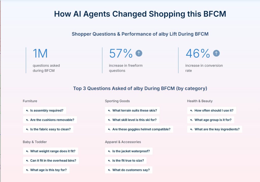 The analysis examined data from 1 million alby conversations, 27 million customer e-commerce interactions, 1.95 billion shopper events, 3.7 million orders, and $531 million in total sales across 144 retail brands, found that freeform questions climbed 57% from the mid-week baseline, highlighting that AI-assisted shopping is now core to decision-making during peak retail moments.