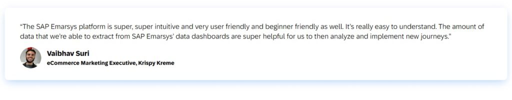 SAP Emarsys’ onboarding support and ongoing strategic guidance helped Krispy Kreme address these constraints by introducing automation and streamlining processes, enabling their small team to do more with less. The platform’s pre-built workflows allowed them to set up and execute complex campaigns with minimal manual input. Automated triggers, such as emails sent for abandoned carts or special promotions, reduced the workload while ensuring timely and consistent communication with customers. This automation empowered the team to focus on strategic growth and creative campaign development rather than getting bogged down in administrative tasks.