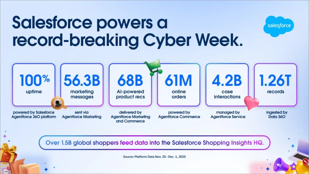 The foundation of Cyber Week’s success for global retailers was the trust and unified power of Agentforce 360. Brands drove profitable growth and scaled their operations, supported by Salesforce’s 100% uptime the entire week, including Agentforce Commerce, which powered 61 million orders on digital storefronts.